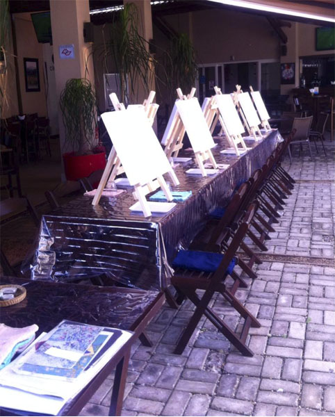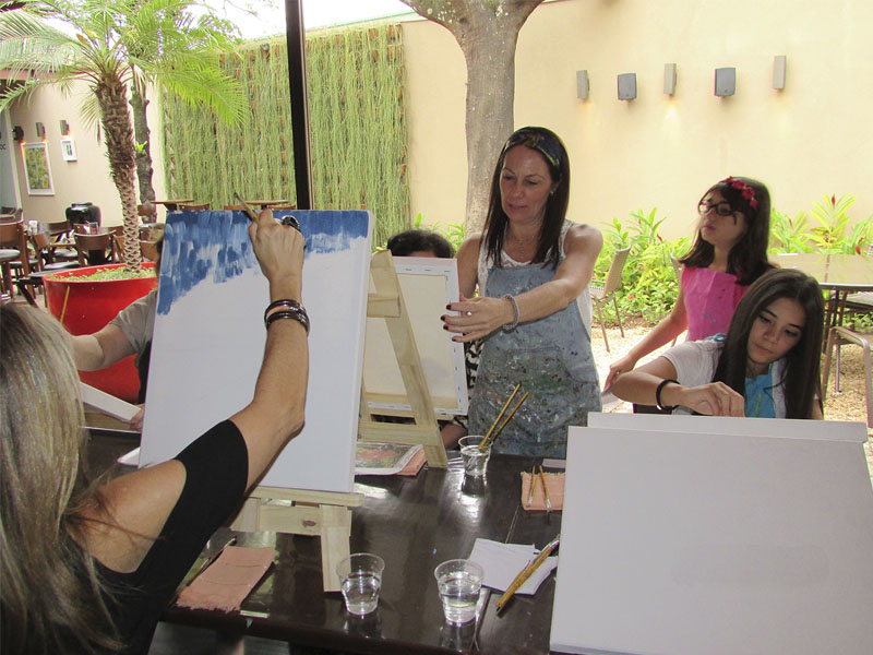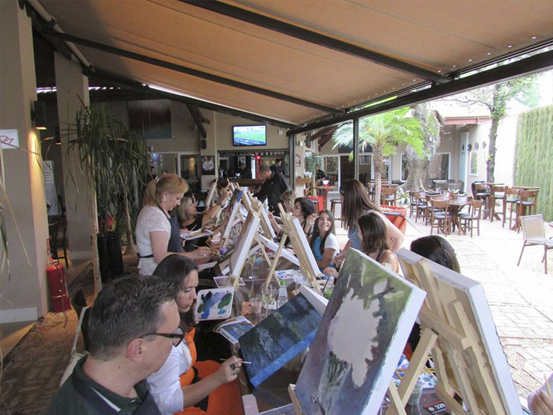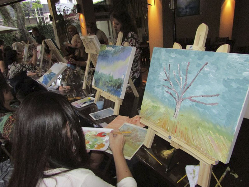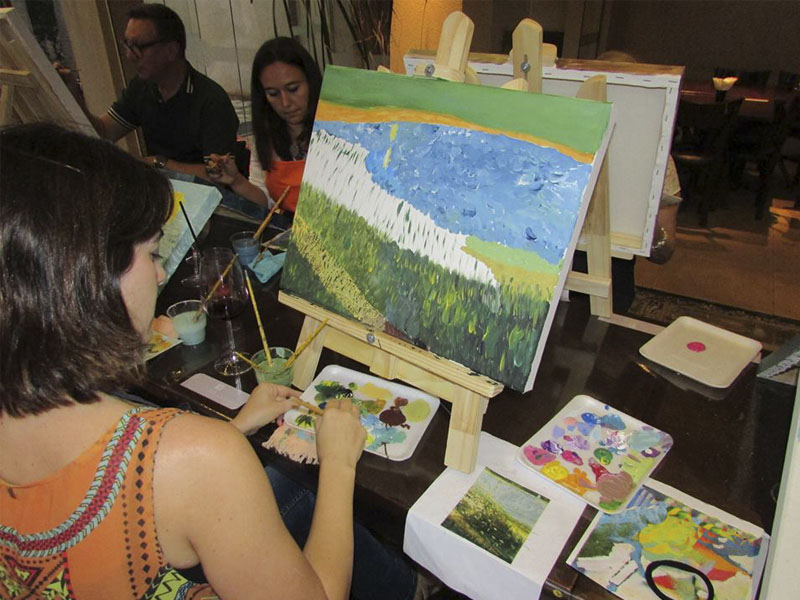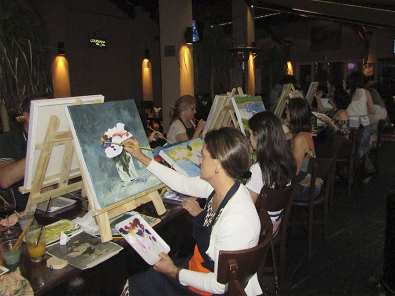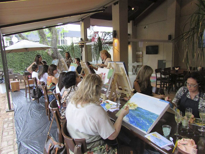 Aula especial de pintura para grupos de até 20 pessoas. Evento a ser realizado em restaurantes ou espaços próprios, de forma descontraída, para estimular o artista que existe, mesmo em quem nunca pintou. Material para pintura incluído.